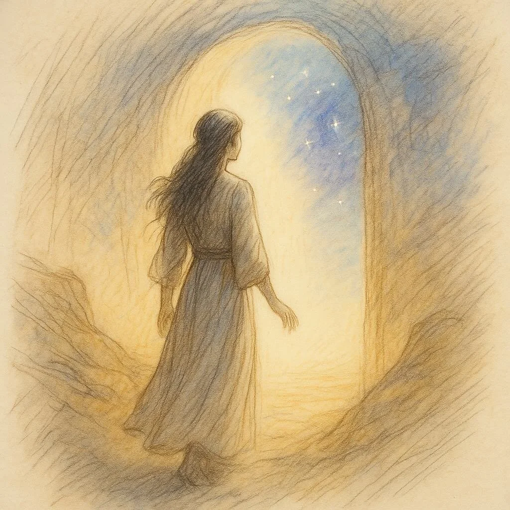 She stepped through the veil of forgetting, into a sky made of remembering.