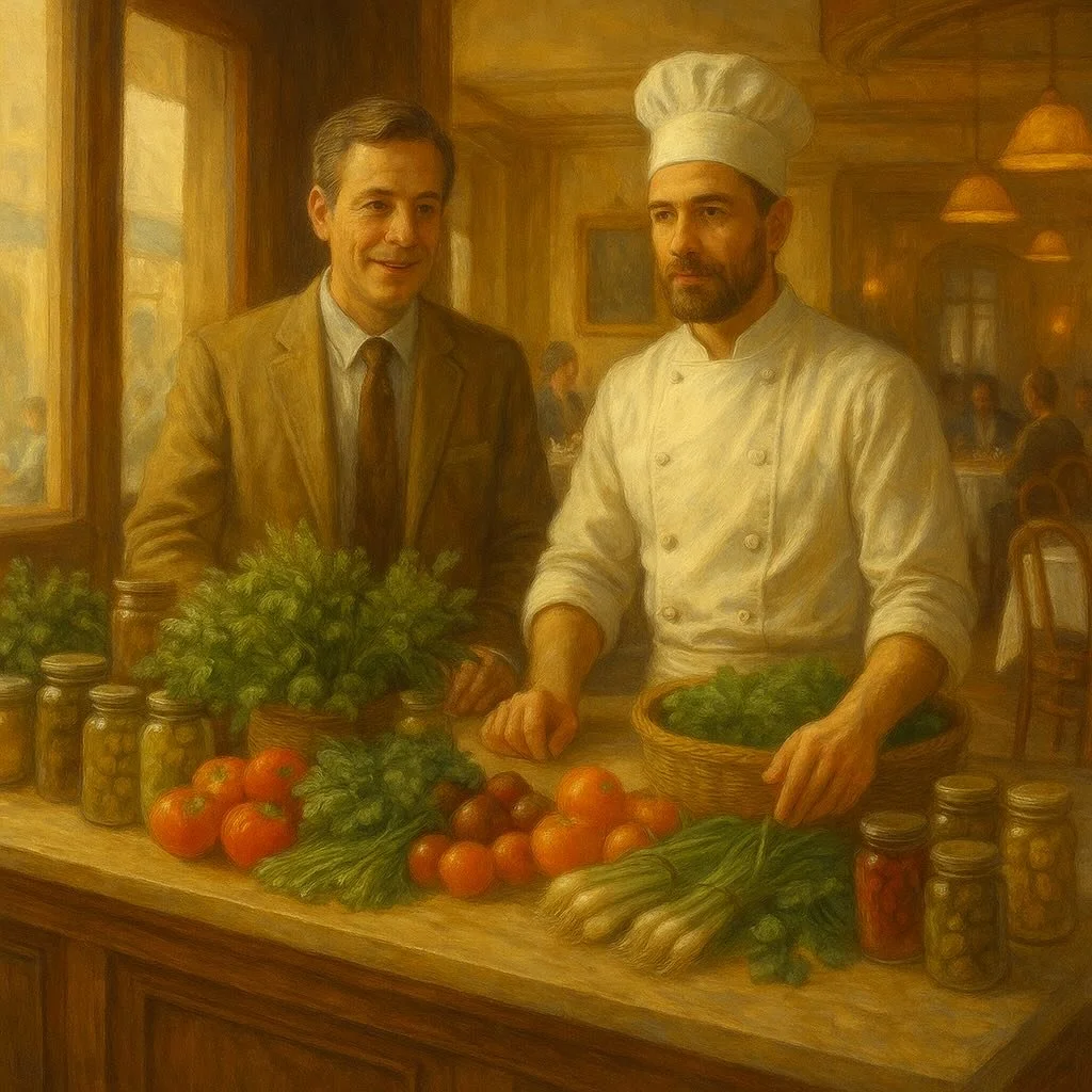The deli counter: a place of ingredients, arrangement, and nourishment—signals a preparatory station. The chef, known to you across thresholds, is a gatekeeper of memory and timing. His presence signals readiness, and the moment of greeting marks a subtle activation.